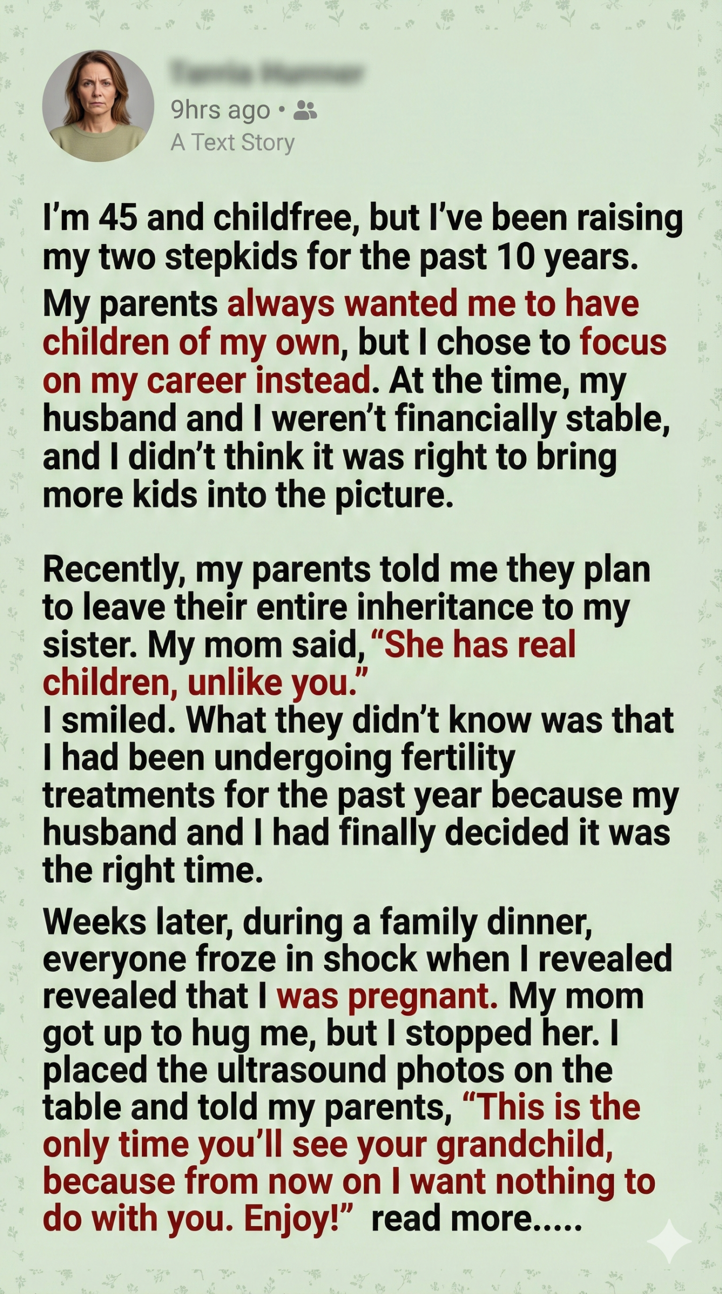 When my mother said, “She has real children, unlike you,” I smiled—but inside, I was burning. What they didn’t know was that I’d been undergoing fertility treatments for a year. My husband and I had finally reached a place where we felt ready. I hadn’t told anyone yet, not even my stepkids. I wanted the moment to be mine. But their decision to erase me from the family legacy pushed me to act. I decided to reveal everything at our next family dinner. I needed them to see me—not as a disappointment, but as a woman reclaiming her story.