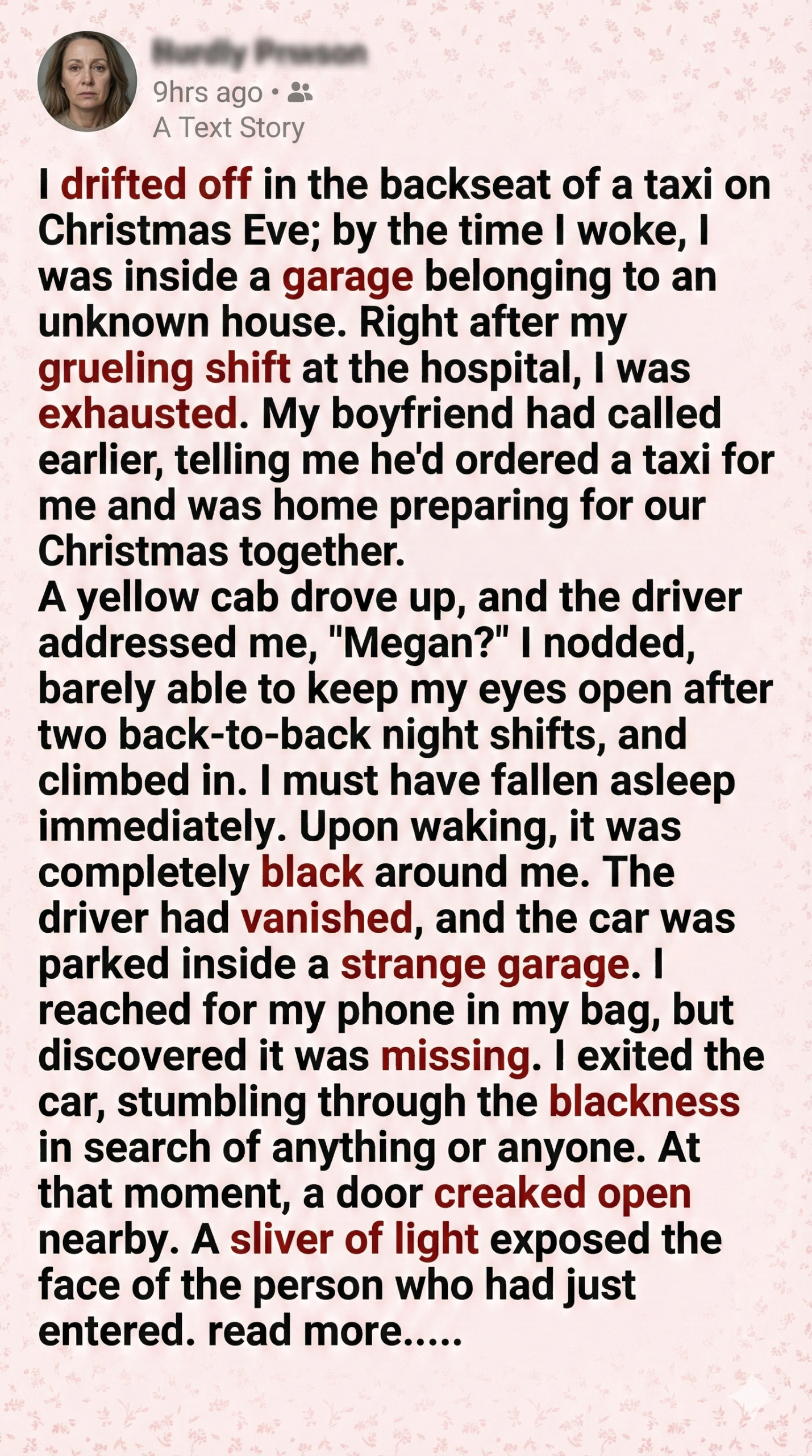 Christmas Eve always felt like a wound I couldn’t close. After a grueling ER shift, I collapsed into the back seat of a yellow cab, longing for warmth and Jeremy’s goofy sweater. But exhaustion won—I fell asleep. When I woke, I wasn’t home. I was alone in a dark garage, the cab abandoned. My phone was gone. Panic surged as a door creaked open and a stranger stepped in, calling me by name. I demanded answers. He said I wasn’t in danger. But his next words shattered me: “Your boyfriend planned this. There’s something you need to know.”