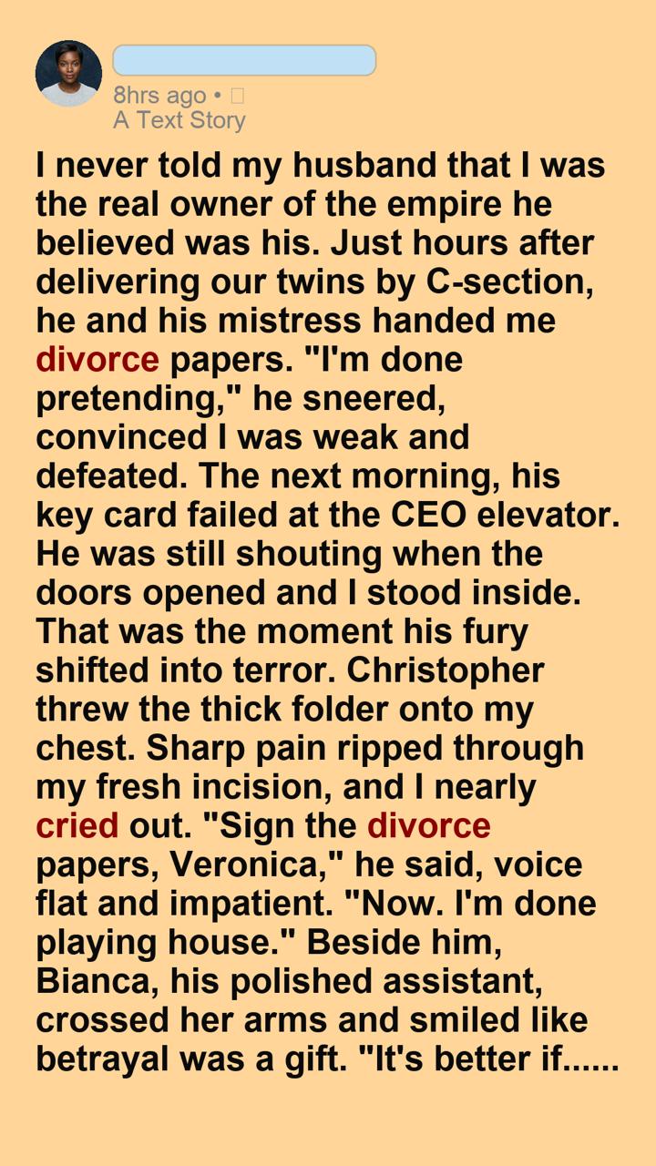 I never told my husband that I was the real owner of the empire he believed was his. Just hours after delivering our twins by C section, he and his mistress handed me divorce papers. “I’m done pretending,” he sneered, convinced I was weak and defeated. The next morning, his key card failed at the CEO elevator. He was still shouting when the doors opened and I stood inside. That was the moment his fury shifted into terror.