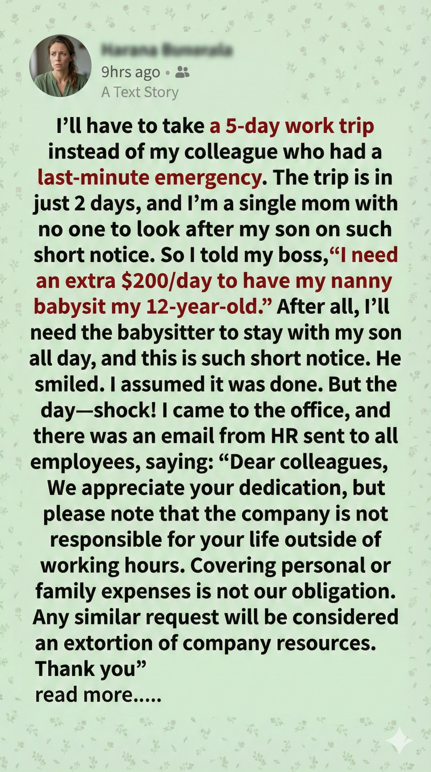 I’ve always been dependable, but this crossed a boundary. I emailed her back, reiterating my refusal and citing company policy. She didn’t respond. Instead, she tried to guilt-trip me in front of colleagues, painting me as selfish. I stood firm. I wasn’t going to be exploited under the guise of loyalty. My job description didn’t include unpaid childcare.