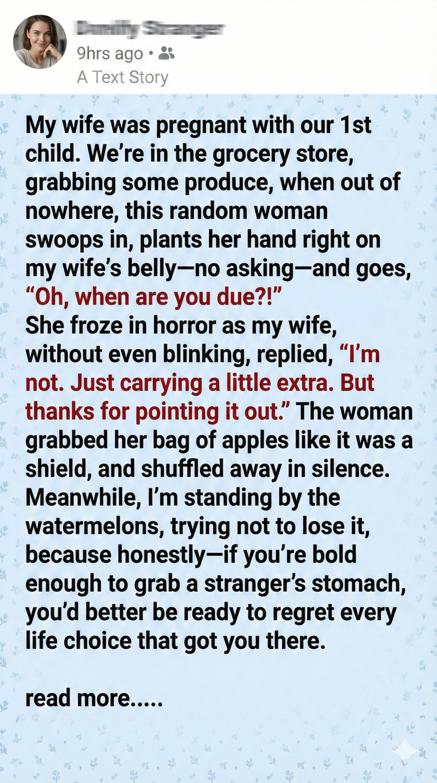 They were shopping for groceries, just a regular afternoon errand. His wife, pregnant with their first child, was browsing the produce section when a stranger suddenly swooped in. Without a word, the woman placed her hand on the wife’s belly and chirped, “Oh, when are you due?” The wife froze, stunned by the invasion of personal space. But without missing a beat, she replied, calm and cool, “I’m not. Just carrying a little extra. But thanks for pointing it out.”