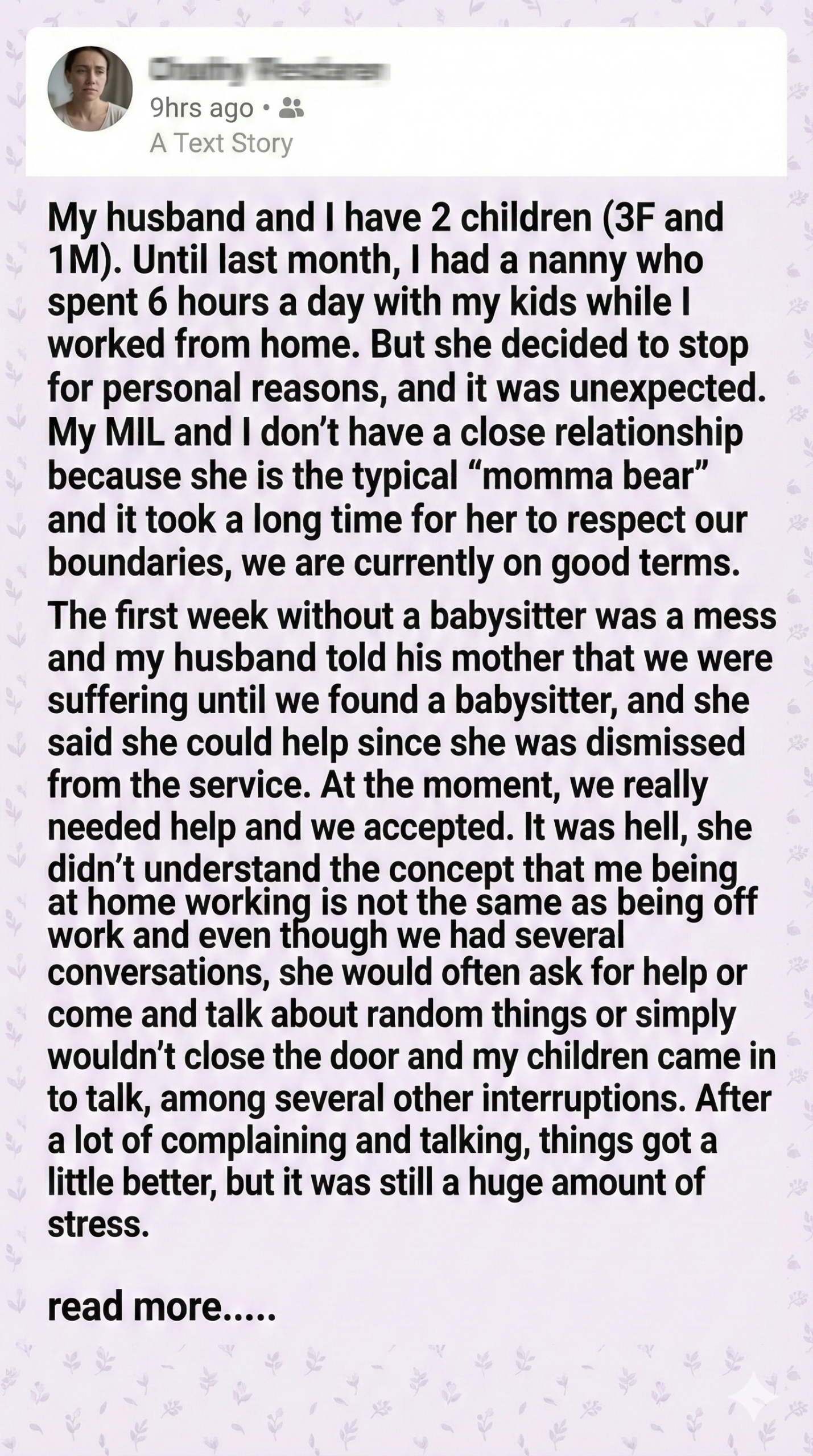 Thankfully, our former nanny was available again. She starts Monday. I feel guilty, but I also feel relieved. Family support is valuable, but not when it comes at the cost of mental health and professional stability. Boundaries matter—and sometimes, love means saying no.
