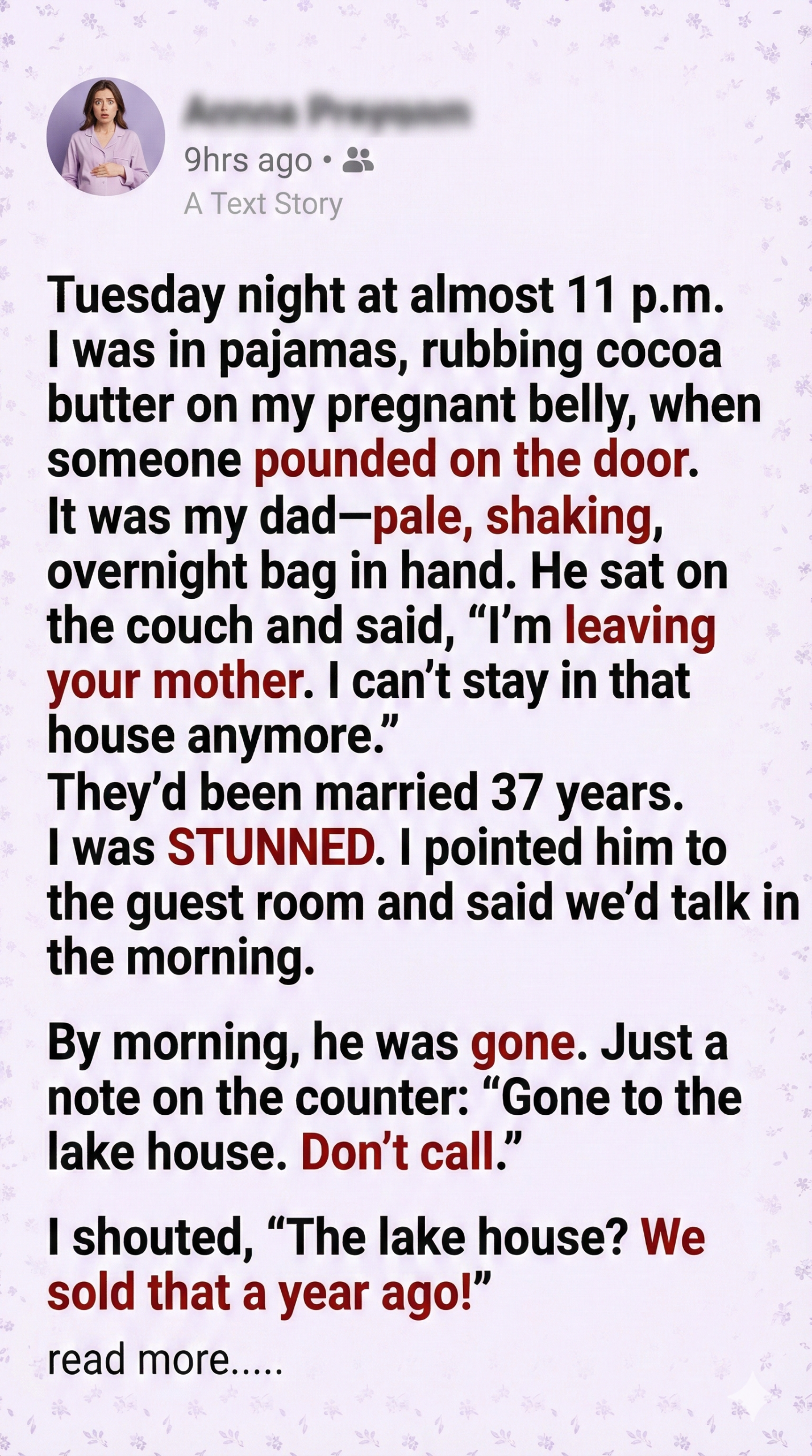 Tuesday night, nearly 11 p.m. I was in pajamas, cocoa butter in hand, soothing my pregnant belly, when a knock shattered the quiet. My dad stood there—ashen, trembling, clutching an overnight bag. He stepped inside, collapsed onto the couch, and whispered, “I’m leaving your mother. I can’t stay in that house anymore.”