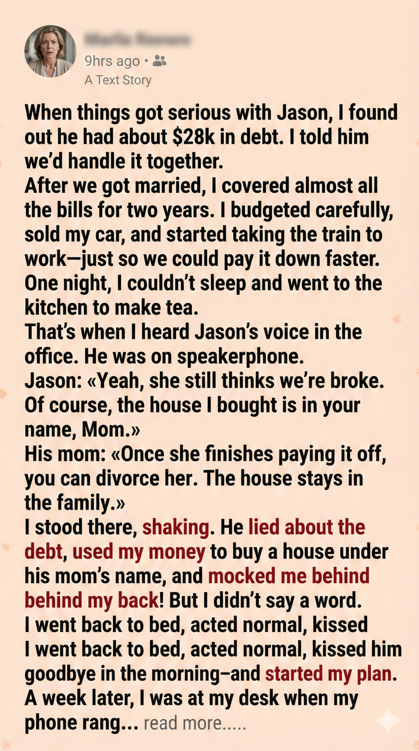 Then one night, I overheard him laughing on the phone with his mother. They’d bought a house—secretly. In her name. While I was still paying off his debt.