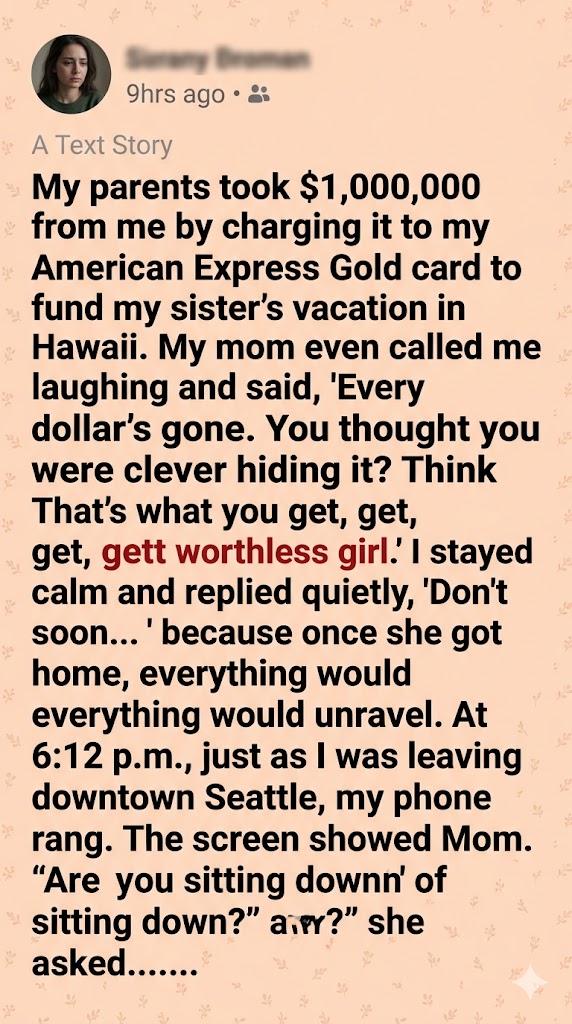 My parents took $1,000,000 from me by charging it to my American Express Gold card to fund my sister’s vacation in Hawaii. My mom even called me laughing and said, “Every dollar’s gone. You thought you were clever hiding it? Think again. That’s what you get, worthless girl.” I stayed calm and replied quietly, “Don’t laugh too soon…” because once she got home, everything would unravel.