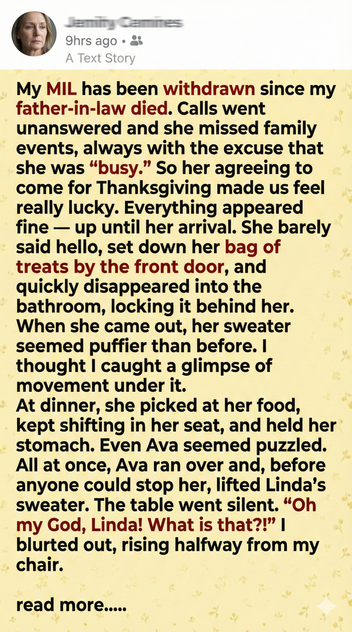 After my father-in-law passed, Linda—my mother-in-law—retreated from the world. Calls went unanswered. Invitations were declined. Her absence at birthdays and anniversaries was always explained away with a vague “I’m busy.” So when she agreed to join us for Thanksgiving, it felt like a breakthrough. We were relieved. Hopeful.