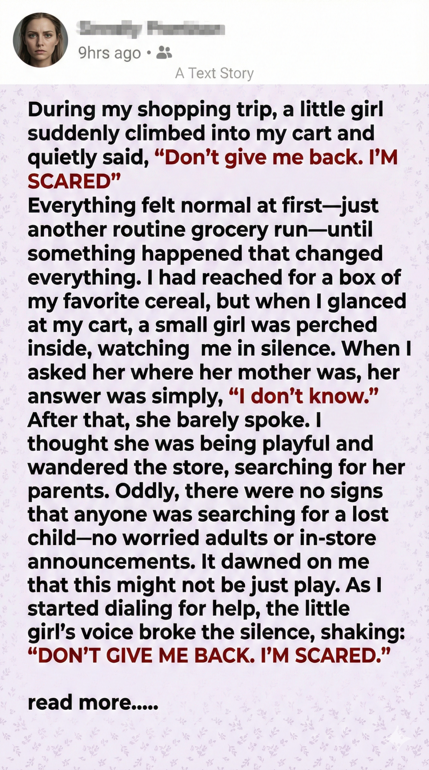 The child’s eyes were wide with fear. Her voice, barely a whisper, trembled: “Don’t give me back, I’m scared.” That plea shattered the woman’s sense of normalcy. No frantic parent nearby. No explanation. Just a child named Lily, alone and terrified.