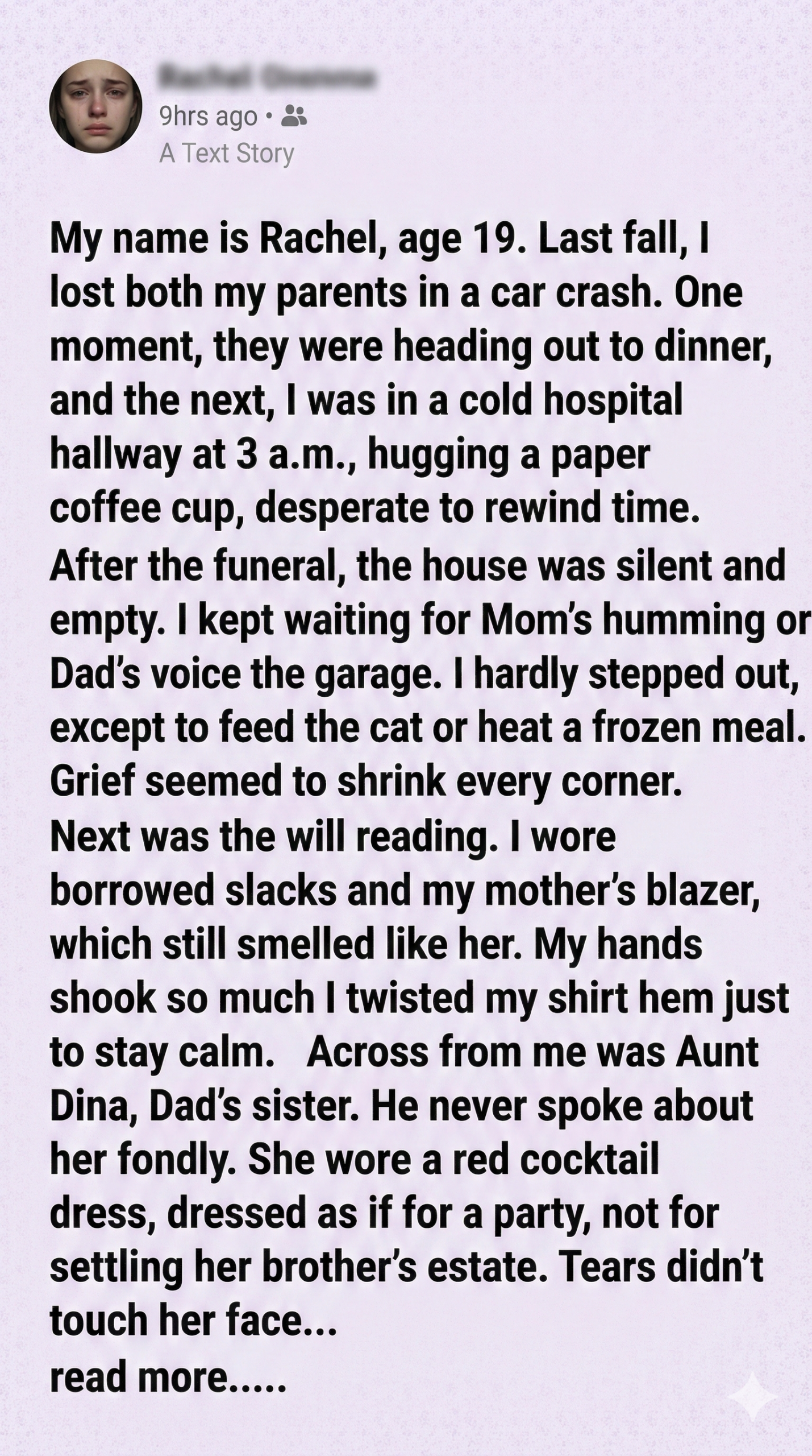 After my parents died in a car crash, I was shattered. The silence in our home was unbearable—no humming from Mom, no garage clatter from Dad. I clung to memories and routines, feeding the cat and microwaving meals, hoping grief would pass like a storm. But the real blow came at the will reading. My Aunt Dina, who barely acknowledged us when my parents were alive, inherited the house. I was stunned. She didn’t mourn—she smirked. And just days later, she showed up at my door, demanding I pack and leave. I had nowhere to go. She didn’t care.