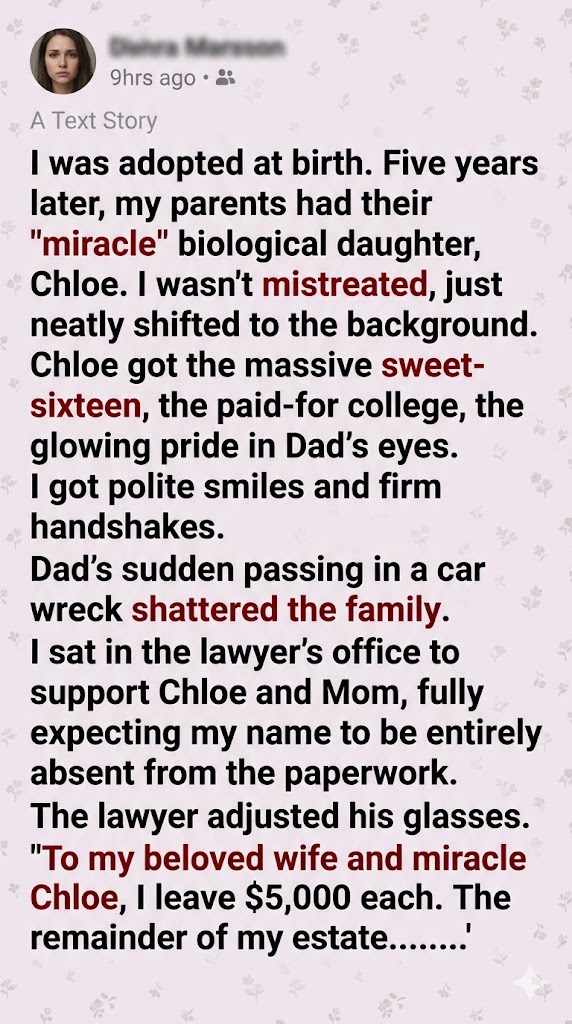 The silence in the room was absolute, heavy, and suffocating. I stopped breathing. Chloe’s phone, which she had been casually scrolling on beneath the mahogany table, slipped from her fingers and clattered to the floor. Mom turned pale, her eyes darting from the lawyer to the document in his hands as if it were a venomous snake.