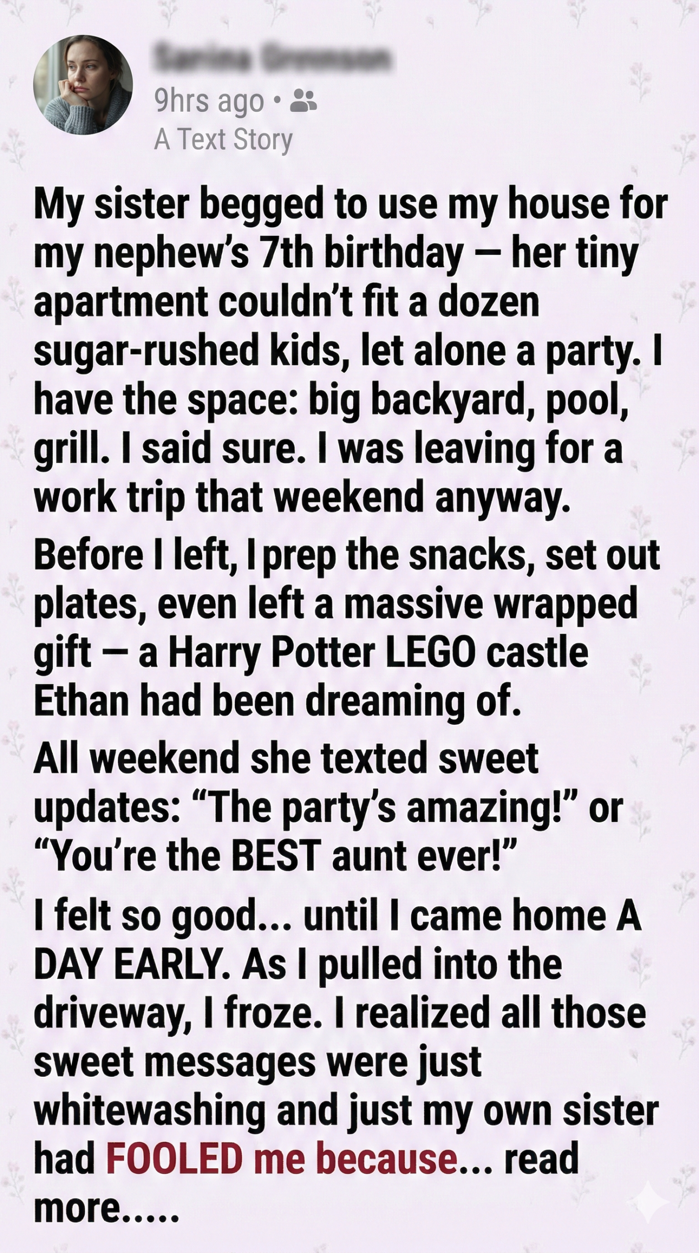 When my sister begged to use my house for her son’s birthday, I said yes. She needed space, and I’d be out of town. I even left snacks and a big gift. Her sweet texts made me feel like the best aunt ever… until I came home early and found a pink balloon arch and a banner I’ll never forget.