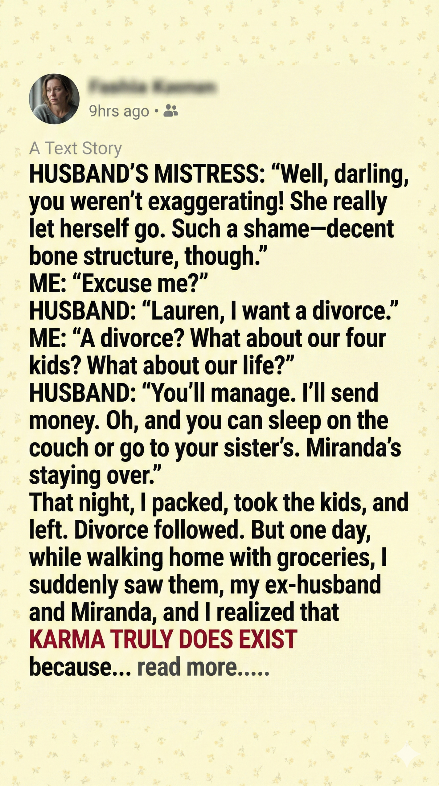 He kept the house. The car. The furniture we picked out together. I kept four children, a broken heart, and a determination I didn’t know I possessed.