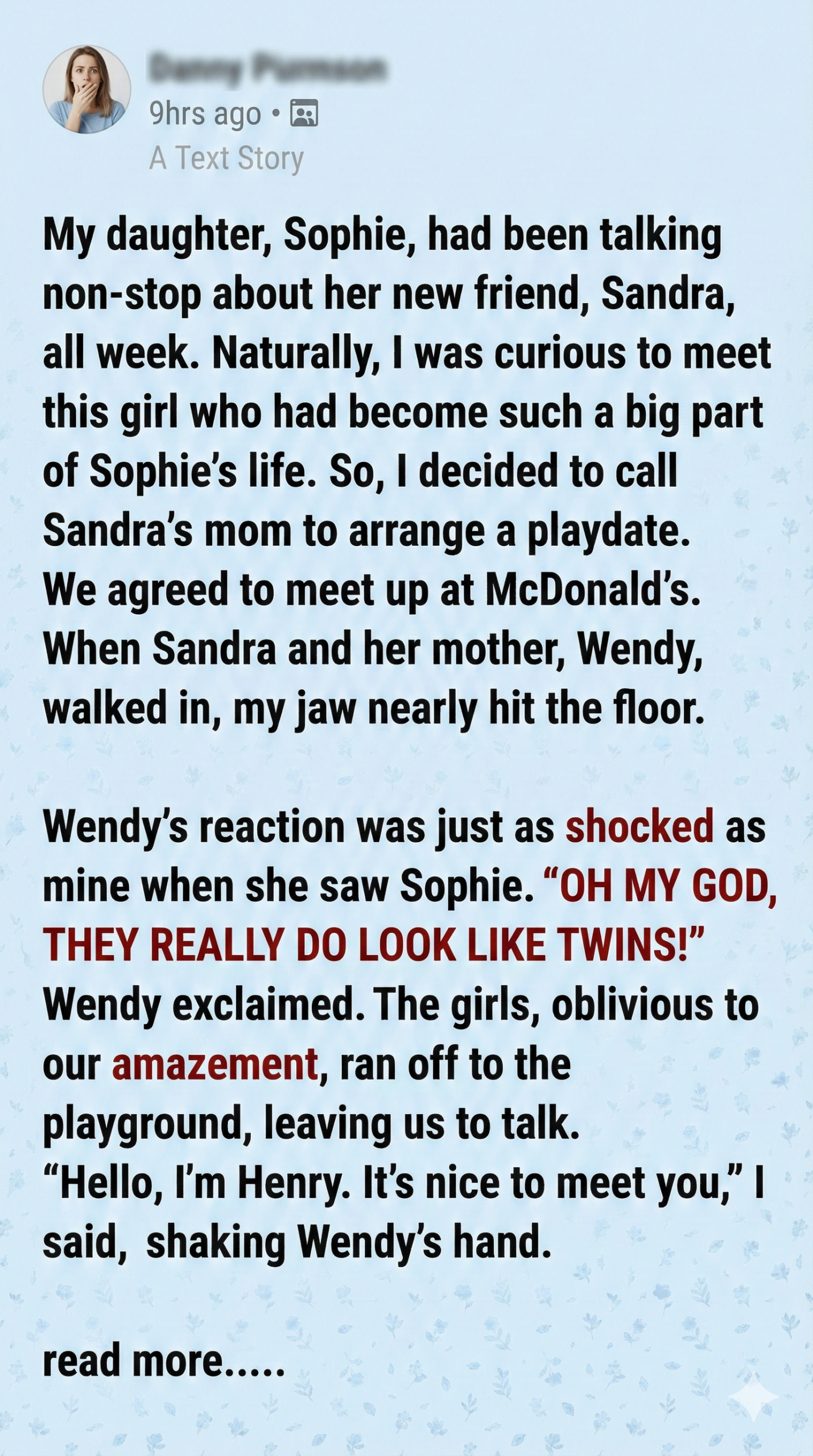 After relocating from Texas to Los Angeles, Henry hoped for a fresh start with his seven-year-old daughter, Sophie. But on her first day at school, Sophie met Sandra—a girl who looked exactly like her. The resemblance was uncanny. They were the same age, had similar features, and even shared mannerisms. The girls bonded instantly, convinced they were twins separated at birth.