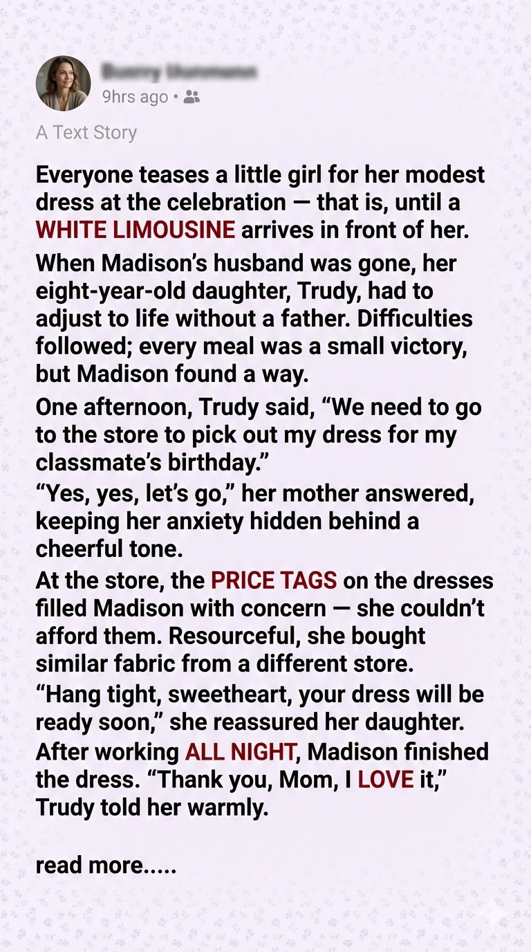 At a lavish birthday party, young Trudy arrived in a handmade dress stitched by her mother, Madison—a single parent struggling to make ends meet after losing her husband, Joe, in a mining accident years earlier. The invitation had come with a cruel condition: all guests were expected to wear dresses from an expensive boutique. Unable to afford one, Madison spent her last few dollars on fabric and sewed through the night, pouring love into every stitch.