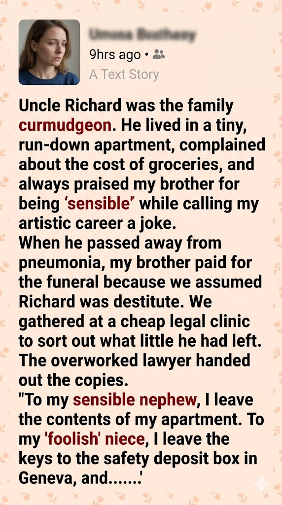 I stayed seated for a moment longer, clutching the envelope to my chest. Uncle Richard had lived his entire life in disguise, hiding his genius behind a scowl and a worn-out cardigan. He had left David exactly what David valued—the exact change. But to me, he had left the world.