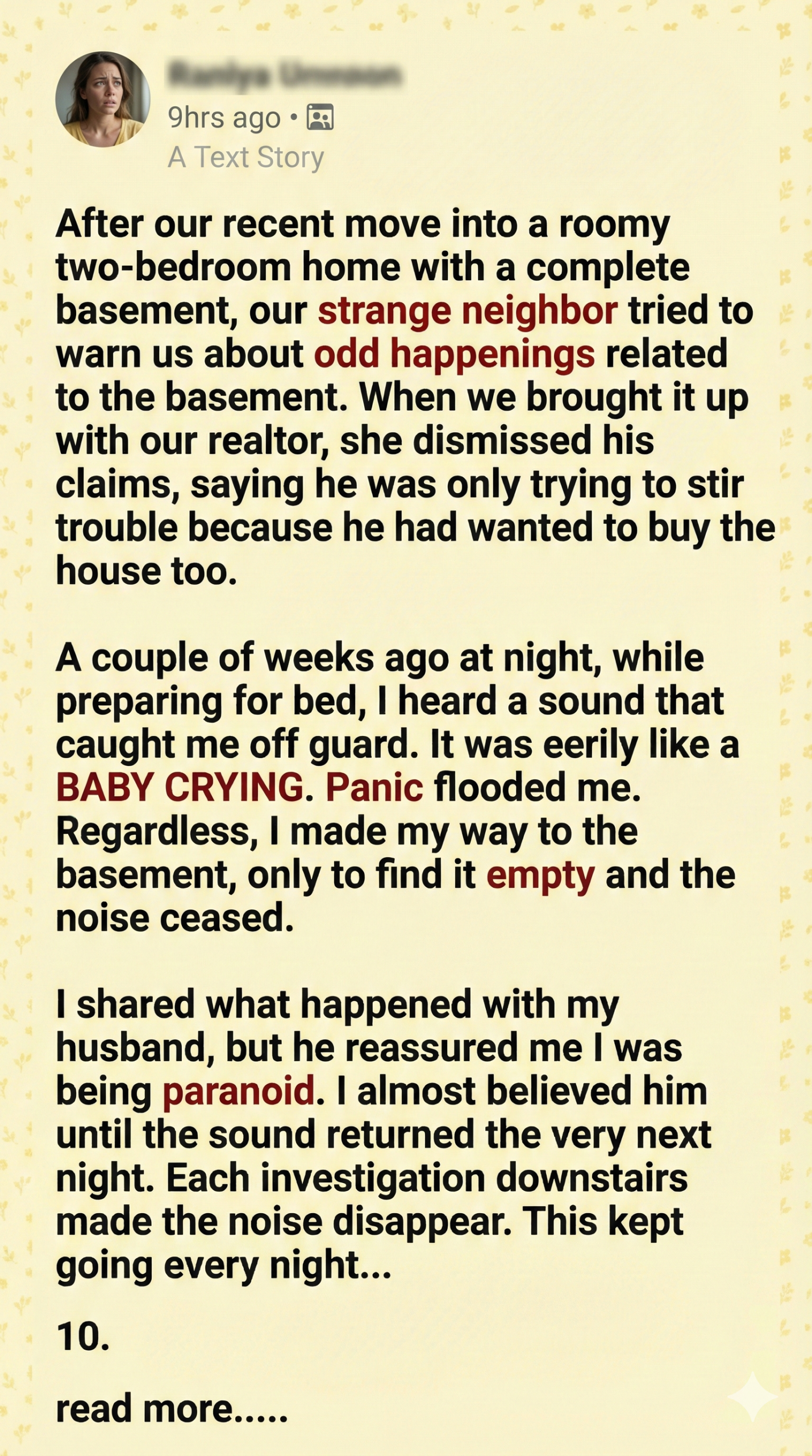 When Sarah and her husband moved into their century-old home, they were chasing a fresh start. The house was charming, if a bit worn, and the basement—cold, musty, and seemingly empty—was the last place she expected to find mystery. But on their third night, a sound pierced the silence: a baby crying. Faint, muffled, and unmistakably coming from inside the basement wall.