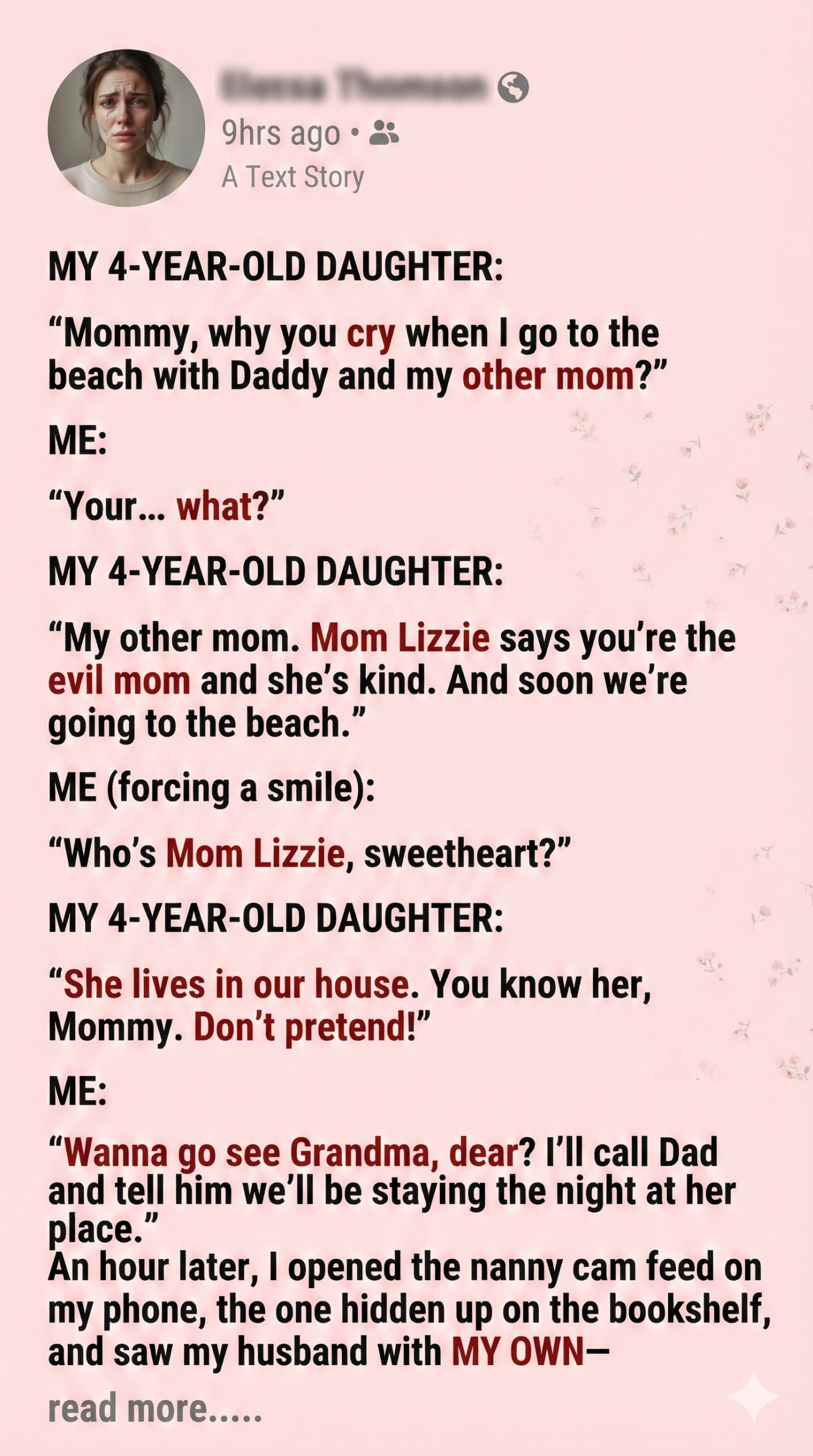 She approached me with a plate of cookies. “I never meant to hurt you. I love Tess like she’s mine.”