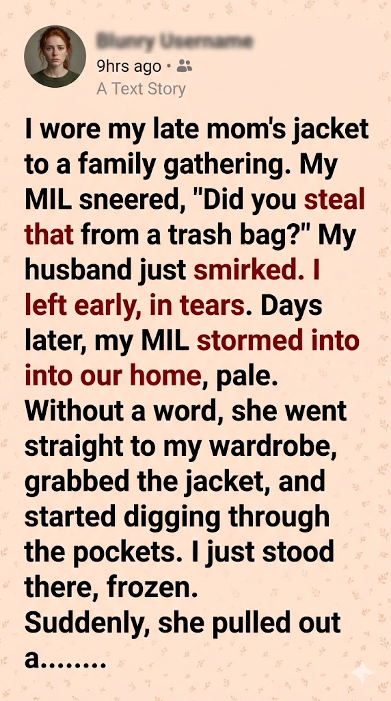 I left early, in tears. Days later, my MIL stormed into our home, pale. Without a word, she went straight to my wardrobe, grabbed the jacket, and started digging through the pockets.