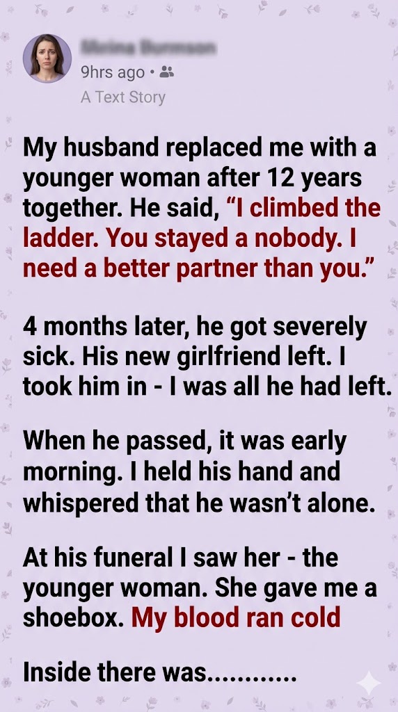 At the funeral, I noticed her—the younger woman—standing awkwardly at the edge of the crowd. Later, she approached, holding a small shoebox.