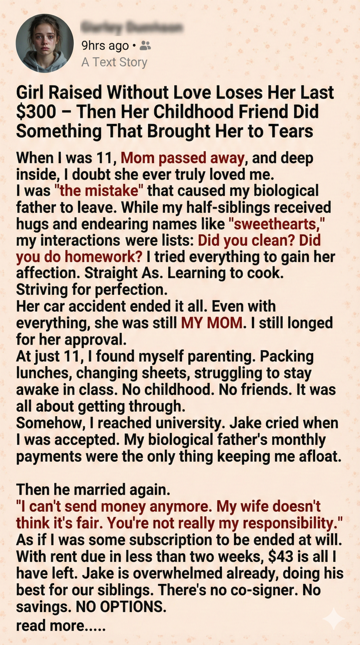 Harper fought desperately to get into the university, relying upon the student loans, a few scholarships, and two jobs, pushing the GPA to the brink of the burnout. She clawed her way in, thinking that if she could make it through, she could outrun the life she was born into. The stepdad, Jake, cried the day she got in, saying he was proud but broke, sincerely stating, “I’m sorry I can’t help more, kiddo. But I’ll always root for you.” The only real money came from the biological father, a monthly $300 deposit, which was his only way of clearing his conscience for the abandonment. That modest amount kept her alive until the father got married again, starting a new life. One day, the deposit just stopped without any warning or a message. Harper waited, thinking it was a bank glitch, then called, only to be sent to the voicemail. She desperately sent texts, but she received no response.