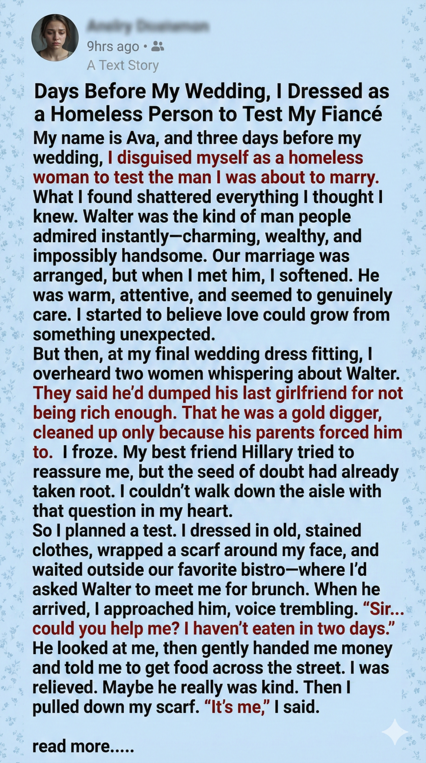 I’m Ava, and days before my wedding, I overheard two women whispering in a boutique—gossip about my fiancé Walter. They claimed he dumped his last girlfriend for not being rich enough. My heart sank. Walter had always seemed kind, attentive, and warm. But doubt crept in. I couldn’t walk down the aisle with questions clawing at my chest. So I devised a test. I disguised myself as a homeless woman and waited outside our favorite bistro. I needed to know: would Walter still show compassion if he thought I had nothing to offer?