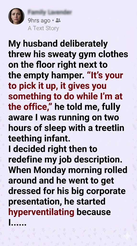 “I picked up your gym clothes, just like you asked,” I whispered, careful not to wake our daughter. “But I realized that managing the household laundry piecemeal wasn’t an efficient use of my time while you’re at the office. So, I consolidated. I’m afraid the Italian wool didn’t agree with your polyester gym shorts.”