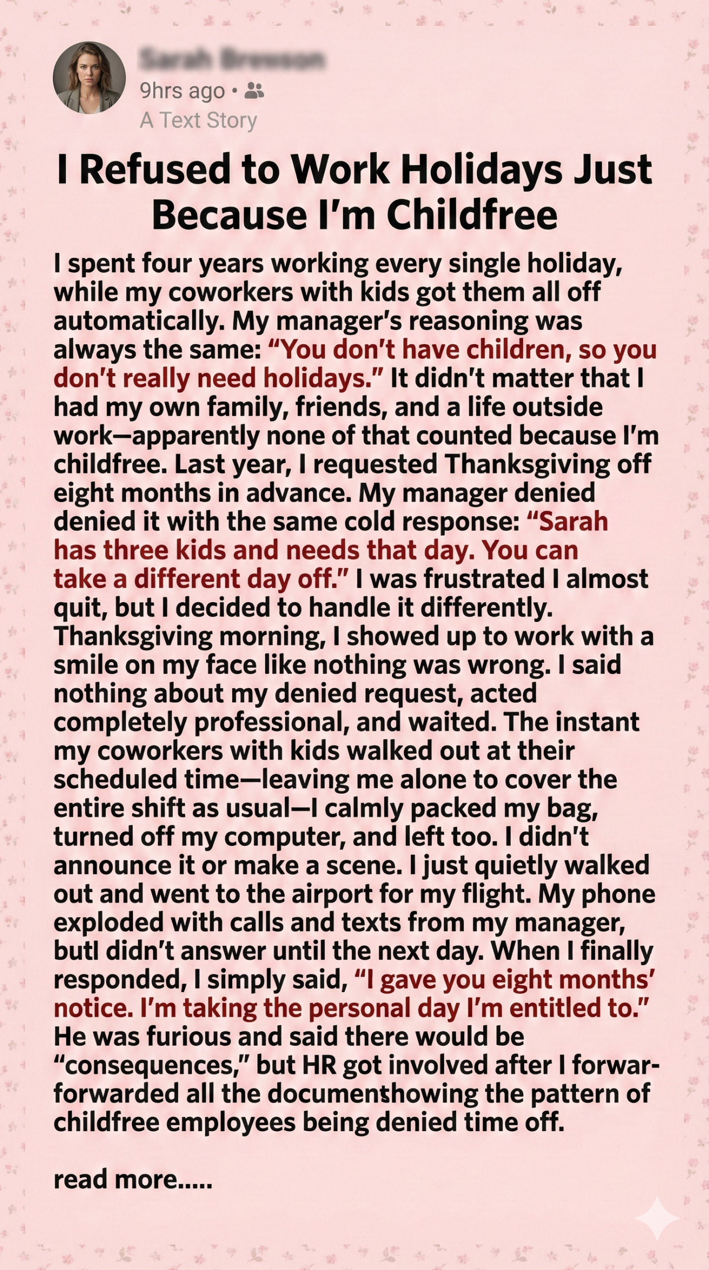 I explained my stance to HR. I wasn’t asking for special treatment—I was asking for equal respect. I proposed a fair rotation system, where holiday shifts aren’t based on parental status but on shared responsibility. Some agreed. Others didn’t. But I knew I’d sparked a conversation that needed to happen. Because this isn’t just about me—it’s about every childfree employee who’s silently overworked and overlooked.