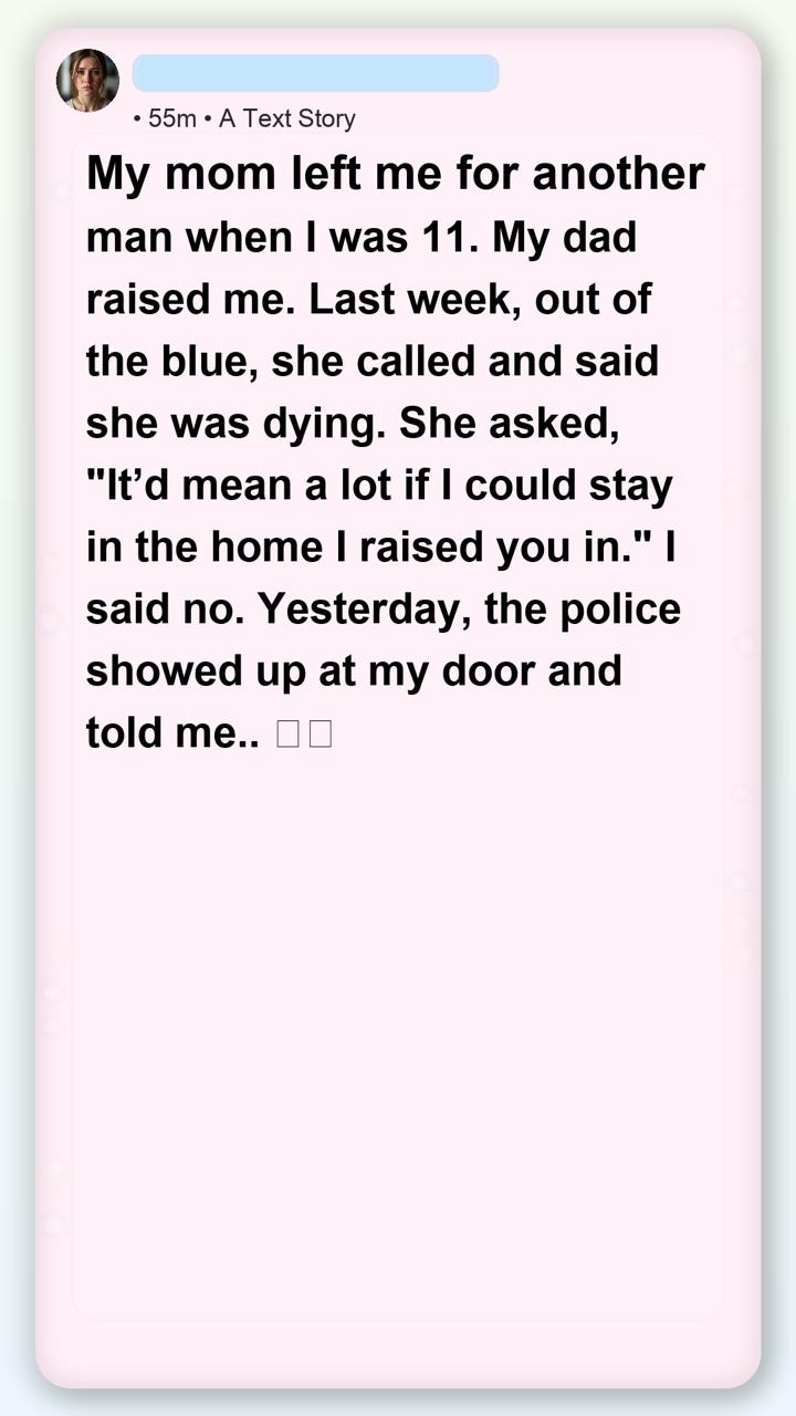 My stomach dropped. For a split second, I thought she had died. Or worse—told them I’d abandoned her.