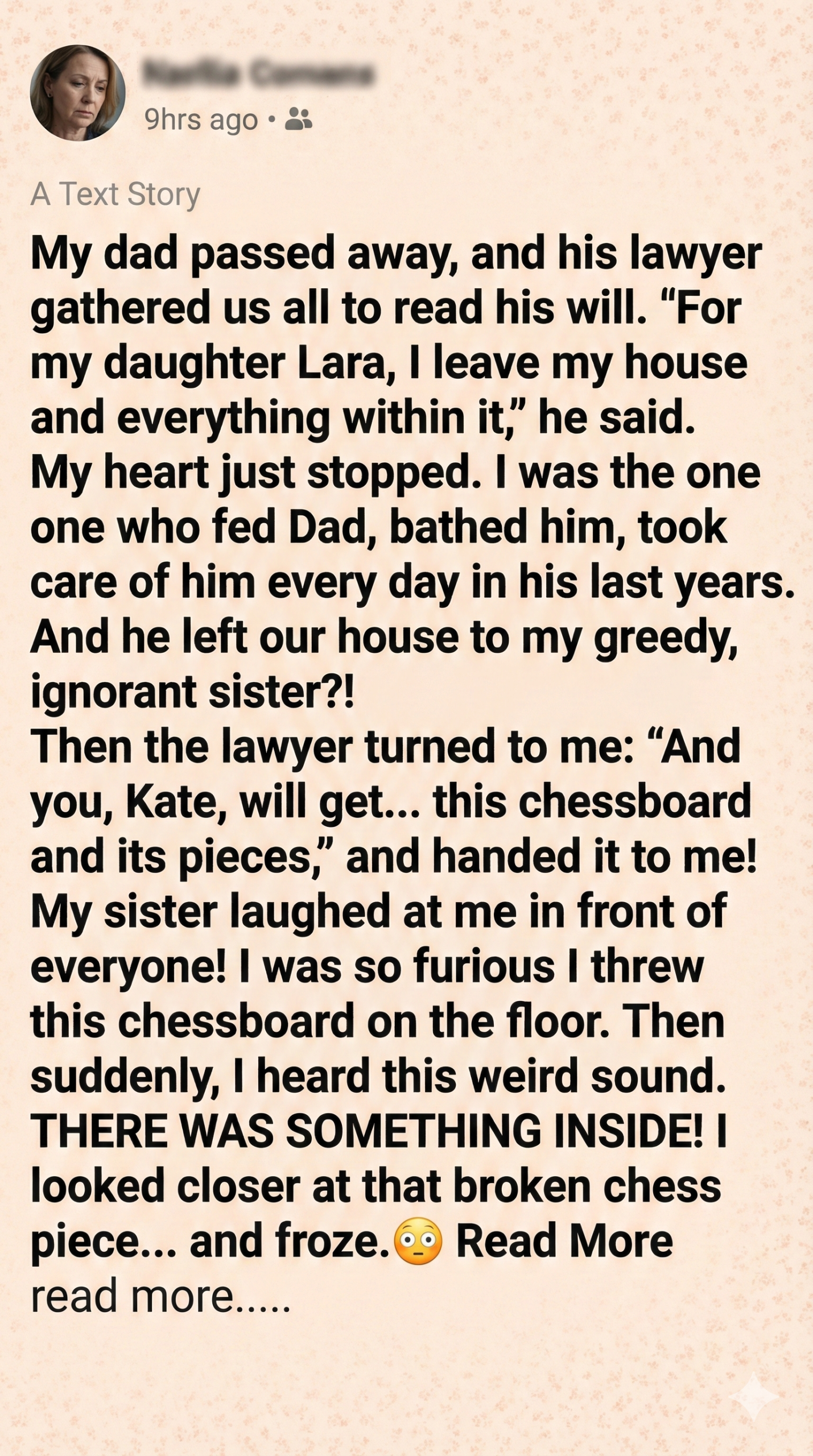 My sister got the house. I got a chessboard. At first, I thought it was my father’s final insult — until I heard something strange rattling inside one of the pieces.