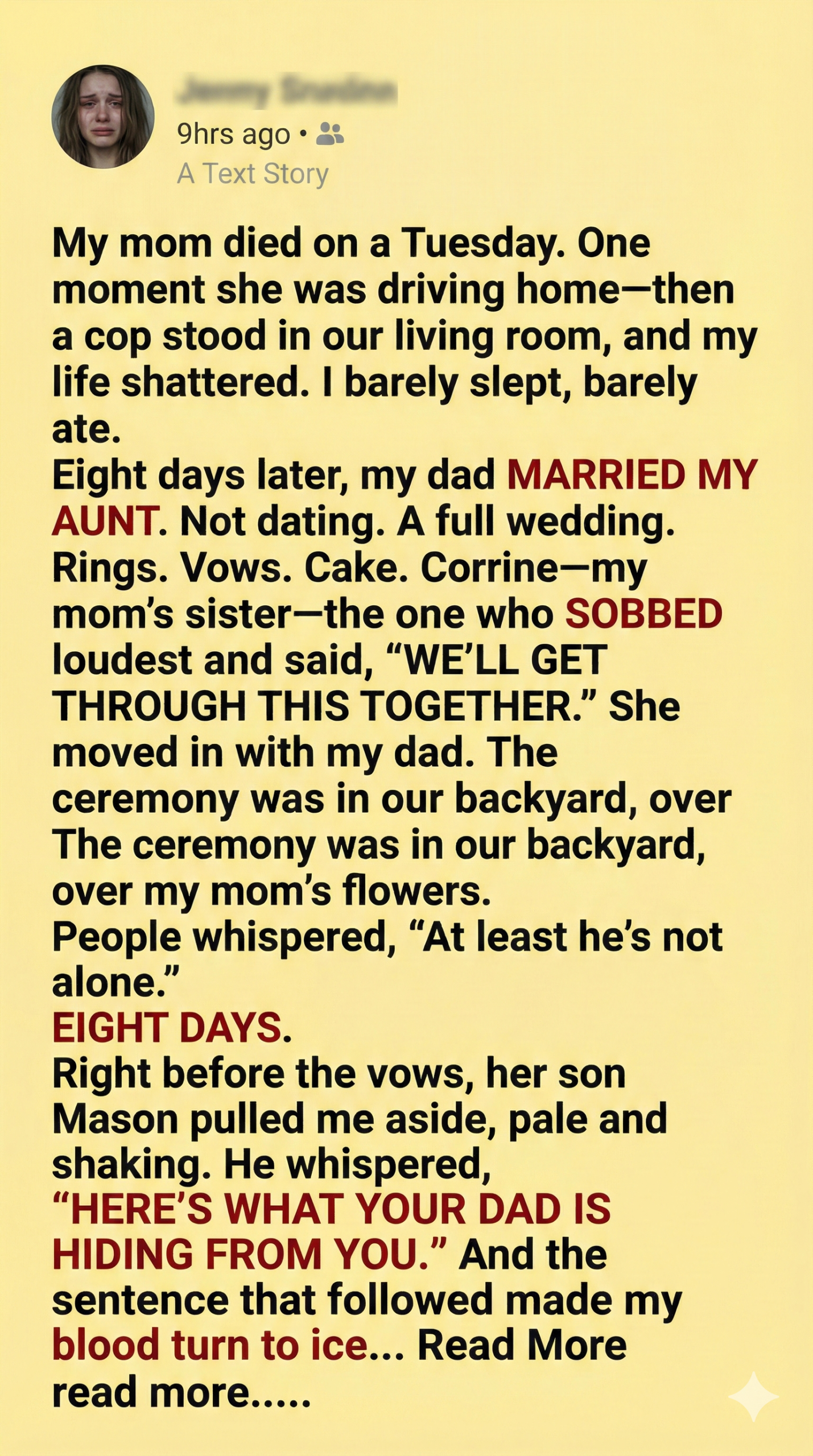 Eight days after my mother died, Aunt Corrine married my father.
