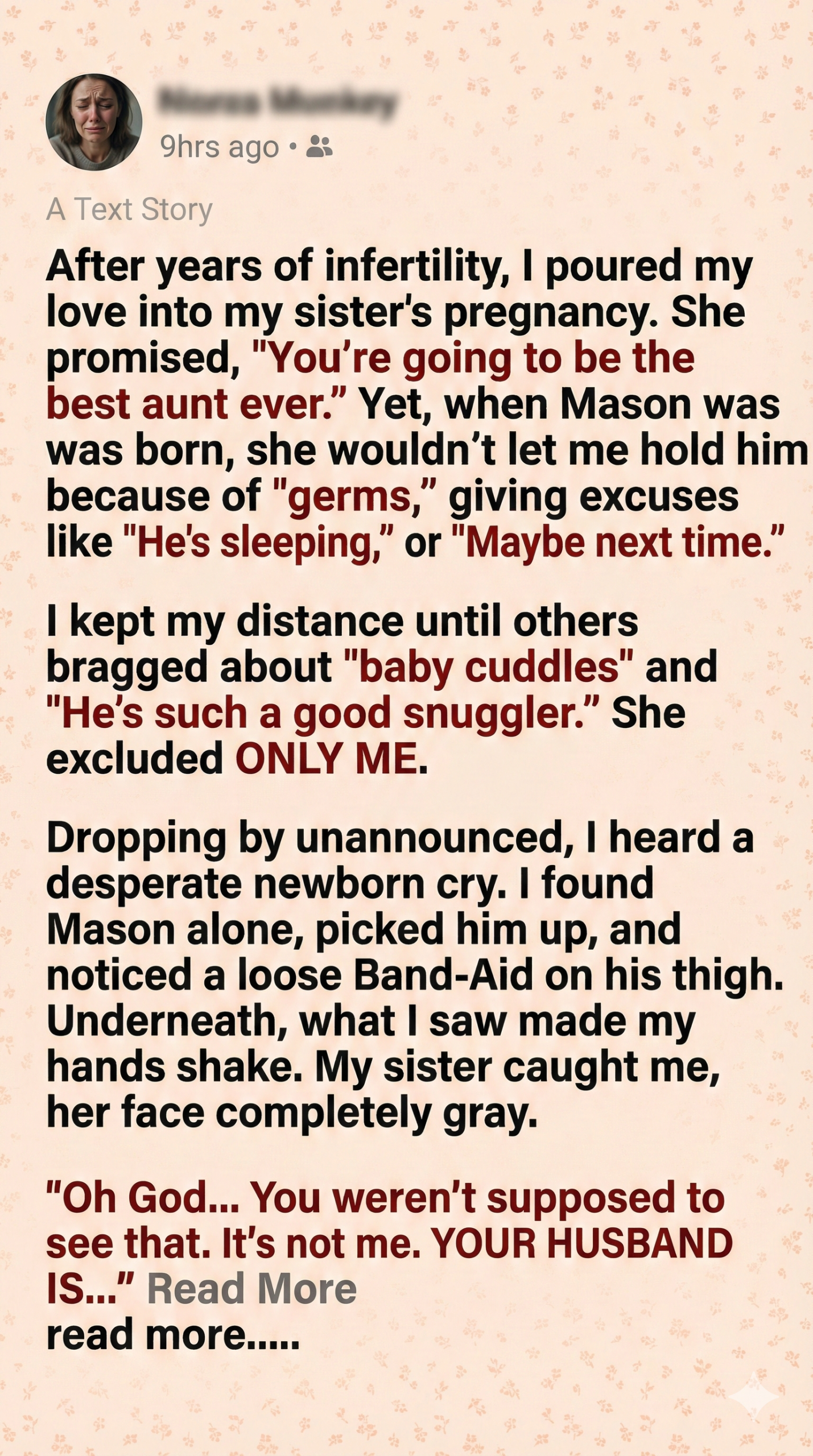 My sister wouldn’t let me hold her newborn for three weeks, while everyone else got baby cuddles. Then I walked in unannounced, heard Mason screaming alone, and picked him up. The Band-Aid on his thigh was peeling, and the second I lifted the corner, my sister came running, begging me to stop.