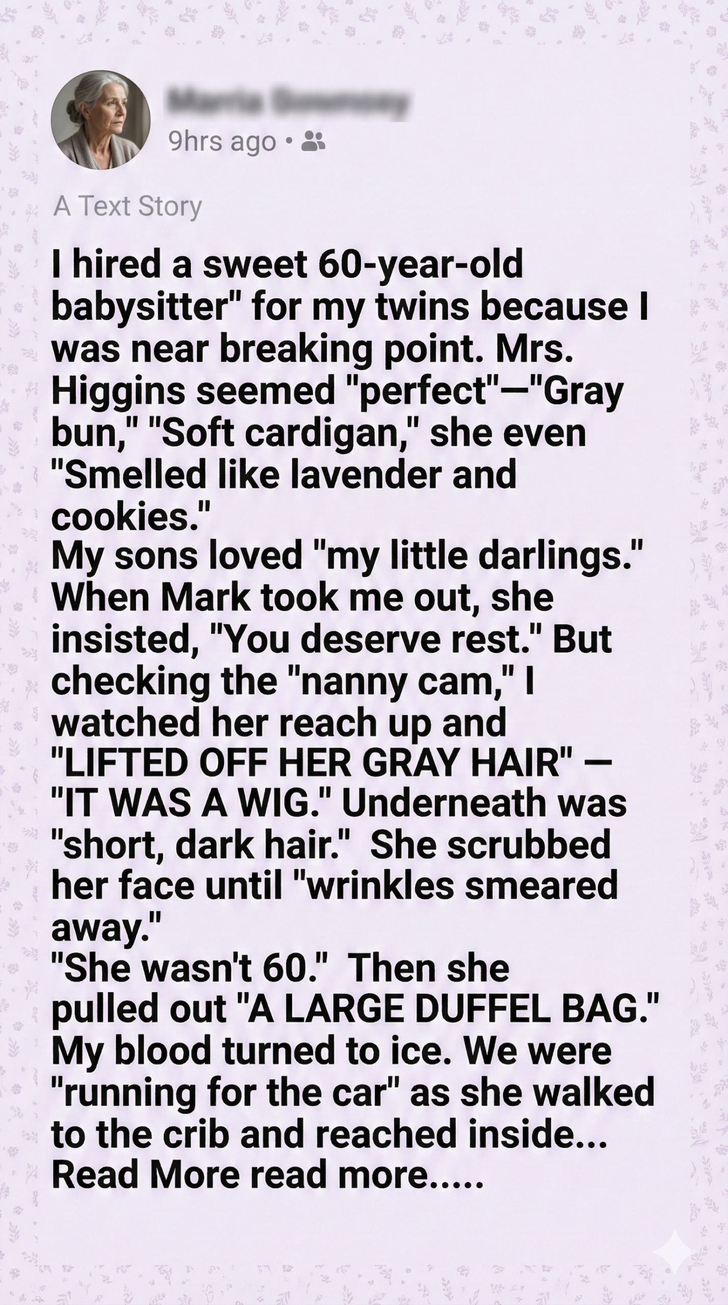 We found Mrs. Higgins, or whoever she was, sitting calmly on the couch, holding Noah against her chest. Liam slept in the crib. The house was peaceful.