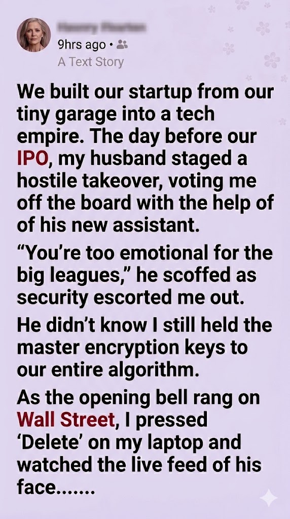 The opening bell of the New York Stock Exchange echoed through the speakers of my MacBook. On my split screen, CNBC broadcasted the jubilant trading floor, while a private, hidden feed from the Synapse boardroom security camera showed David and his newly minted VPâformerly his assistant, Chloeâpopping champagne. They were celebrating the billion-dollar valuation of the neural-network algorithm I had coded on a folding table in our freezing garage six years ago.
