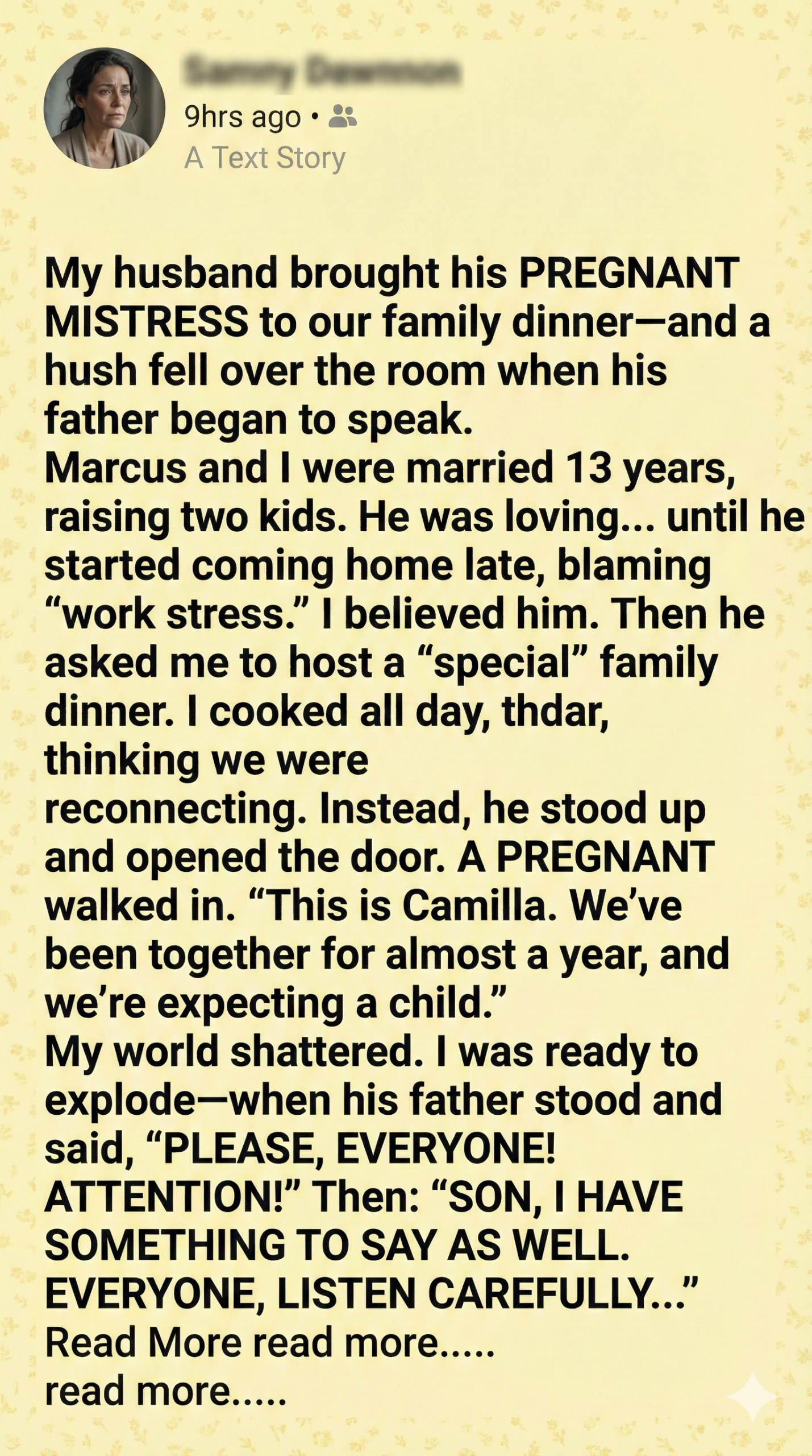 And that’s when the pain really hit me, not just from the betrayal but from the audacity. The casual cruelty of bringing her here and turning our family dinner into his big reveal.