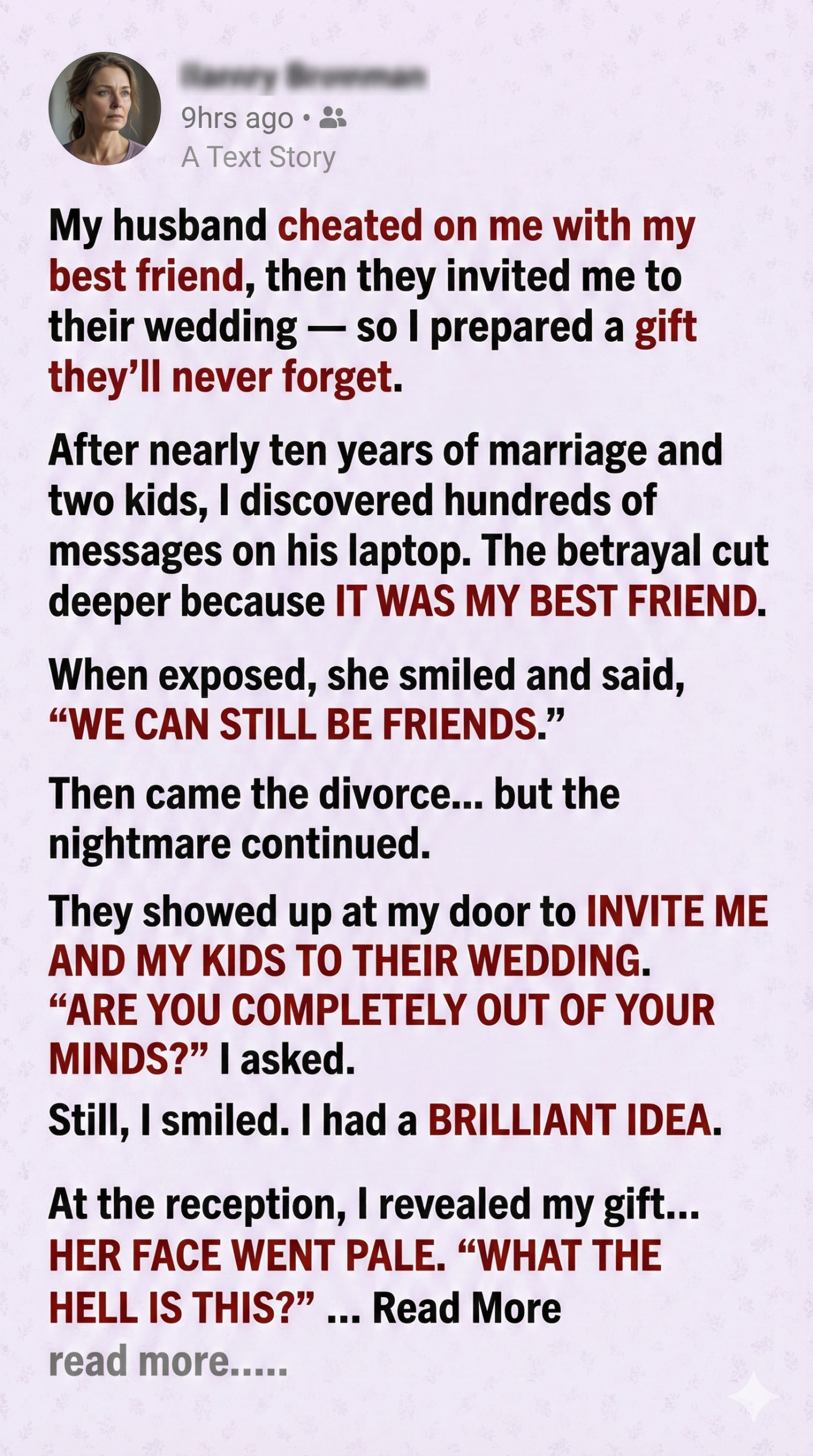When Sarah is invited to the wedding of her ex-husband and ex-best friend, she chooses grace over chaos, or so it seems. In a story about betrayal, resilience, and the power of quiet truth, one woman brings a gift that no one saw coming… and no one will ever forget.
