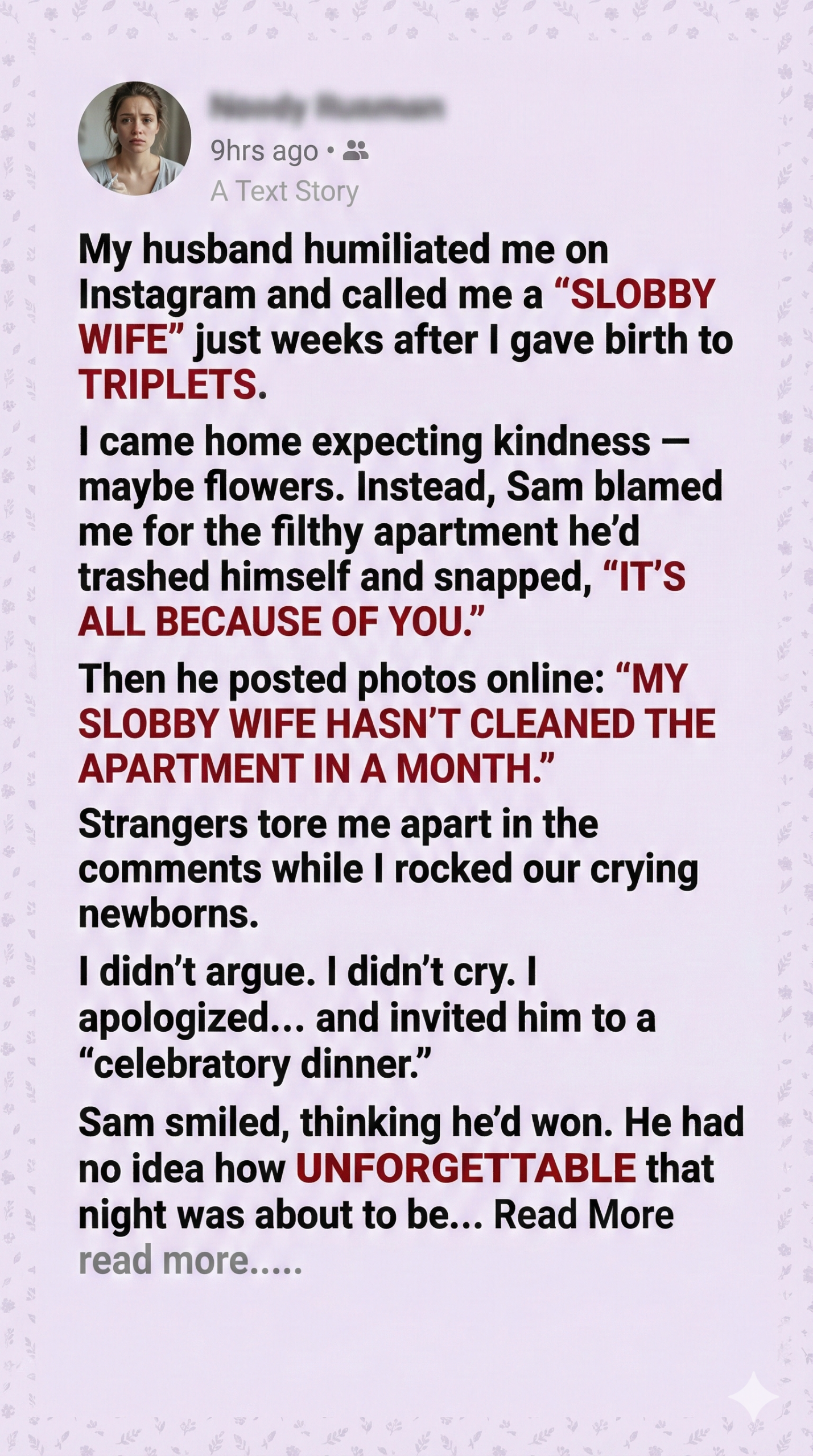 The first thing my husband said after I gave birth to triplets wasn’t “Welcome home.” It was: “You could’ve given birth faster.” He blamed me for the disgusting mess he’d been living in — and posted it on Instagram to humiliate me. So I used his little post to plan a night he’d never forget!