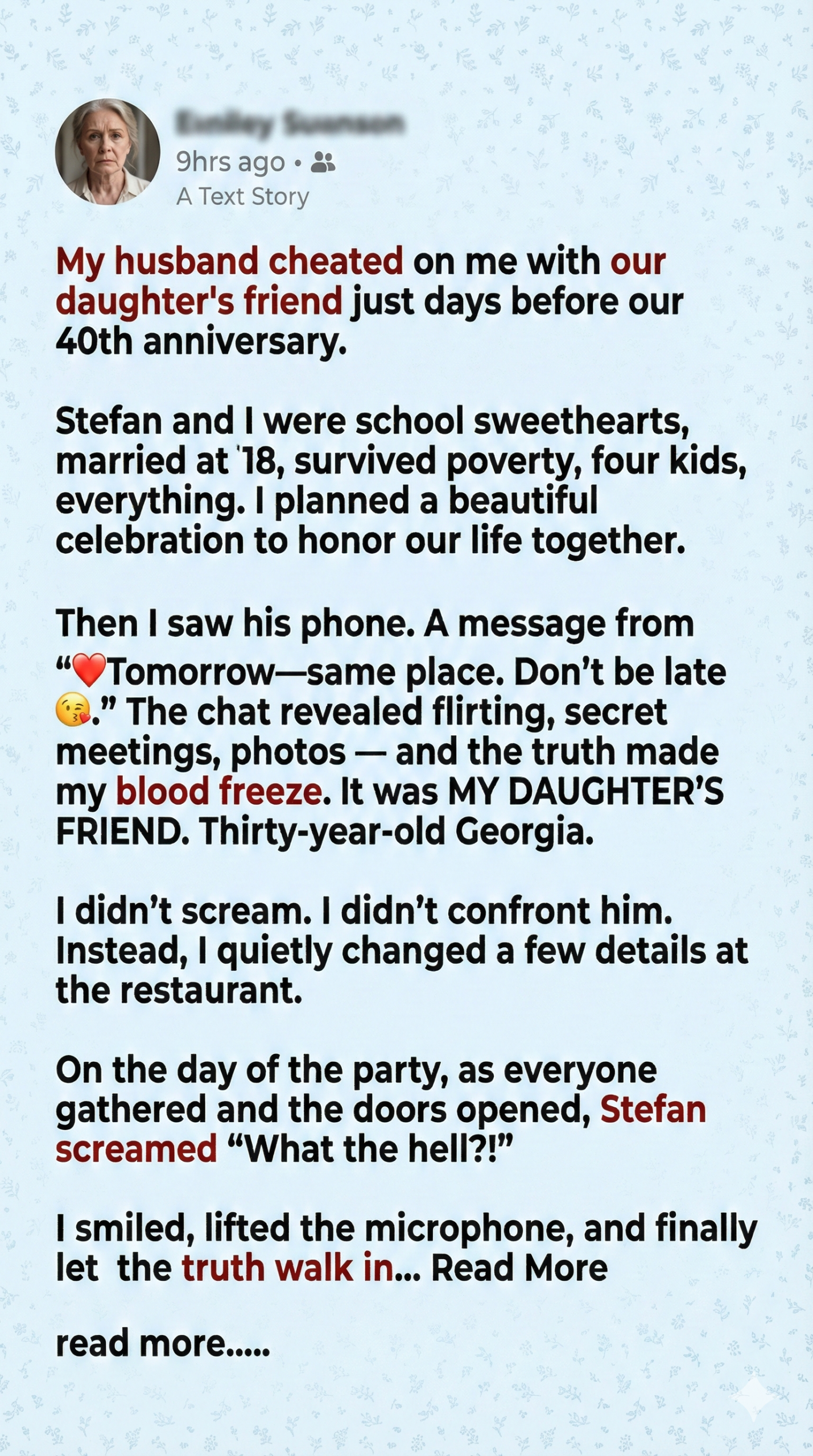 Days before our 40th anniversary celebration, I found flirty messages on my husband’s phone from my daughter’s best friend. What I felt went beyond heartbreak. Instead of confronting him, I planned something he’d never forget.