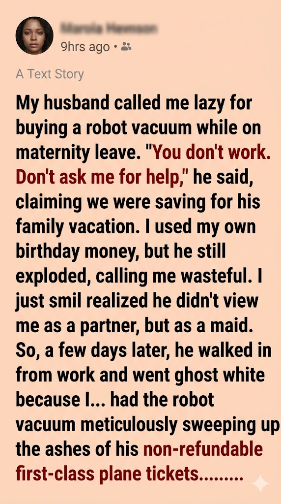 I took a slow sip of my lukewarm coffee, adjusting our sleeping three-month-old daughter in the baby carrier strapped to my chest. “That,” I said calmly, “is the $300 robot vacuum you called me a lazy, wasteful maid for buying.”