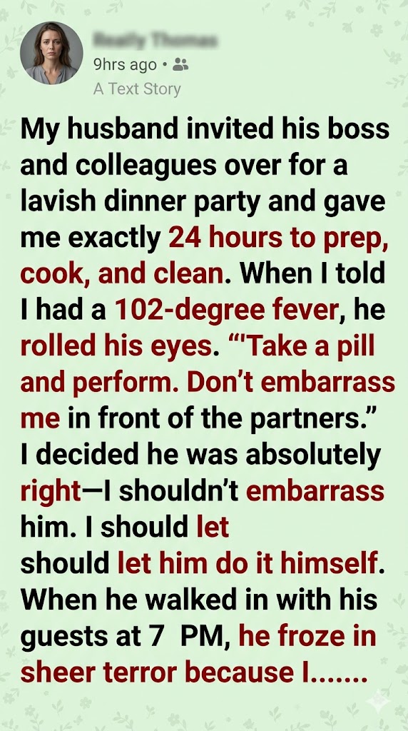 “I’m performing, just like you asked!” I offered a warm, heavily congested smile to the bewildered executives standing in our foyer. “Welcome, gentlemen. I apologize for my attire, but Arthur insisted we simply must host you tonight, even after my fever spiked to 102 this morning. I told him I was highly contagious, but he was adamant. ‘Take a pill and perform,’ he told me. ‘Don’t embarrass me.’ So, here I am! The show must go on.”