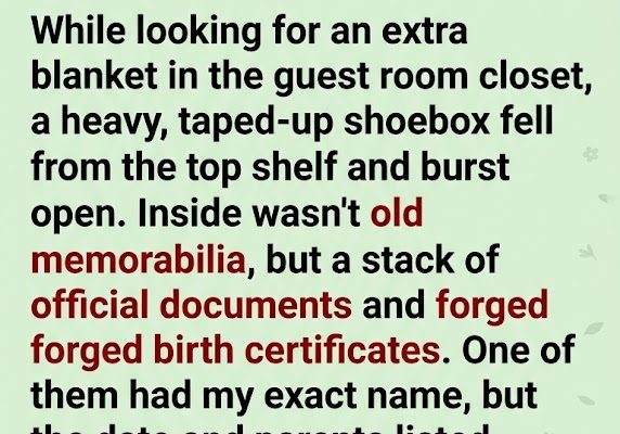 My sister asked me to watch her house for the weekend while she went on a yoga retreat. While looking for an extra blanket in the guest room closet, a heavy, taped-up shoebox fell from the top shelf and burst open. Inside wasn’t old memorabilia, but a stack of official documents and forged birth certificates. One of them had my exact name, but the date and parents listed changed everything I thought I knew about our late father.