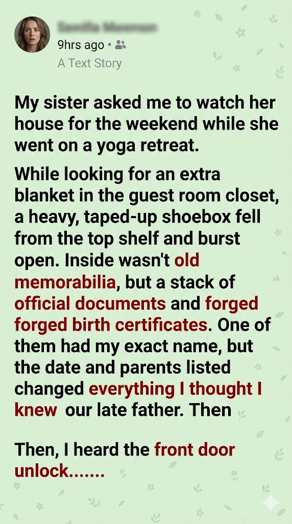 My sister asked me to watch her house for the weekend while she went on a yoga retreat. While looking for an extra blanket in the guest room closet, a heavy, taped-up shoebox fell from the top shelf and burst open. Inside wasn’t old memorabilia, but a stack of official documents and forged birth certificates. One of them had my exact name, but the date and parents listed changed everything I thought I knew about our late father.