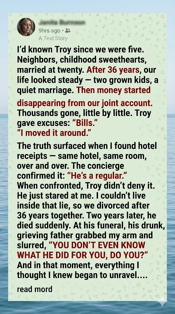 I ended my 36-year marriage after I discovered secret hotel rooms and thousands of dollars missing from our account — and my husband refused to explain himself. I thought I’d made peace with that decision. Then, at his funeral, his father got drunk and told me I had it all wrong.