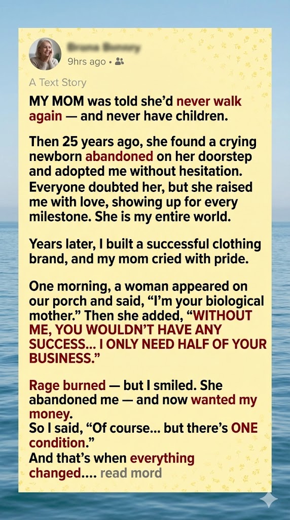 “Sweetheart, you do realize that without me, you wouldn’t have any success, right?” she said. “I’m the one who made sure you were raised by this woman so you’d turn out well. I only need half of your business. That’s fair.”