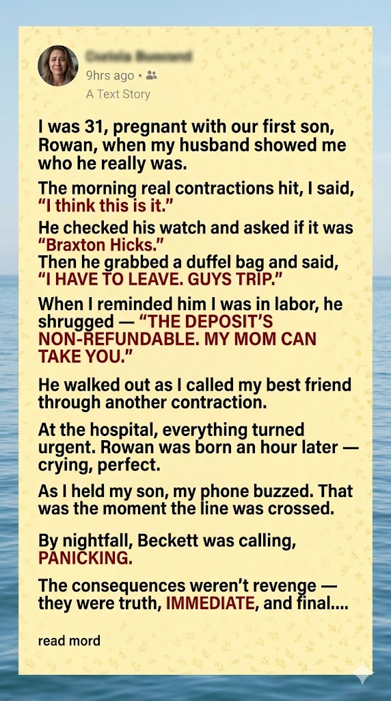 “Text me your contraction times,” she said. Her voice went flat and focused. “I’m leaving work right now. Do not drive. Do not wait for his mother.”