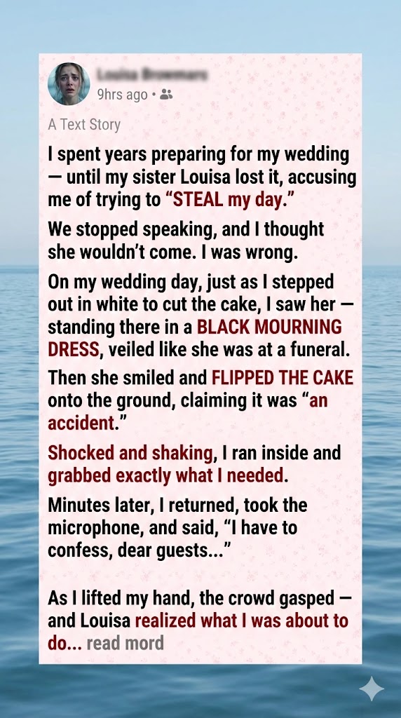 She stood by the cake in a black mourning dress, with a dark veil over her face. The fabric clung to her in a dramatic way, heavy and deliberate. She looked as if she were at a funeral, not her older sister’s wedding.