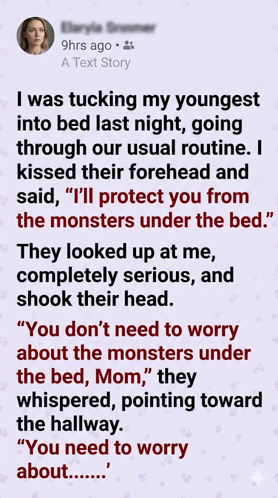 “He stands in the doorway,” my youngest continued, their small fingers gripping the edge of the blanket tightly. “He watches you. But his eyes are wrong, Mom. They’re too wide. And his smile has too many teeth.”