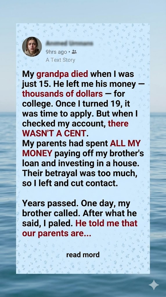 He confessed that he hadn’t known about the money at first. Our parents told him Grandpa had changed his will and that the house investment was for “the family’s future.” But a year after I left, he found Grandpa’s original letter — the one addressed to me. It clearly stated the money was for my education and no one else’s.