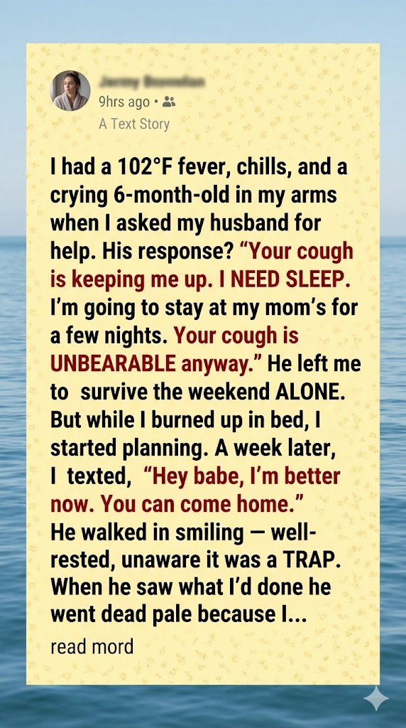 When I recovered enough, I texted: “I’m better now. You can come home.” He rushed back, complaining about his mom’s dog and yard work. I cooked his favorite meal, cleaned the house, and smiled as he relaxed on the couch. Then I struck.