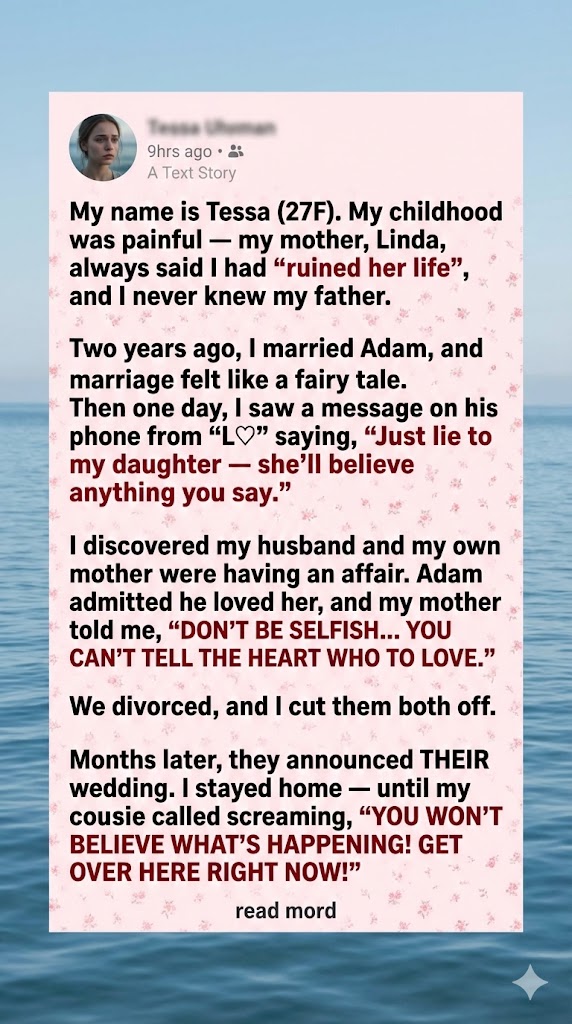 My name is Tessa. I’m 27, and if you told me five years ago that my mother would end up marrying my husband, I would’ve laughed. Not a polite laugh — a loud, gasping one, followed by a sarcastic, “Yeah, right.”