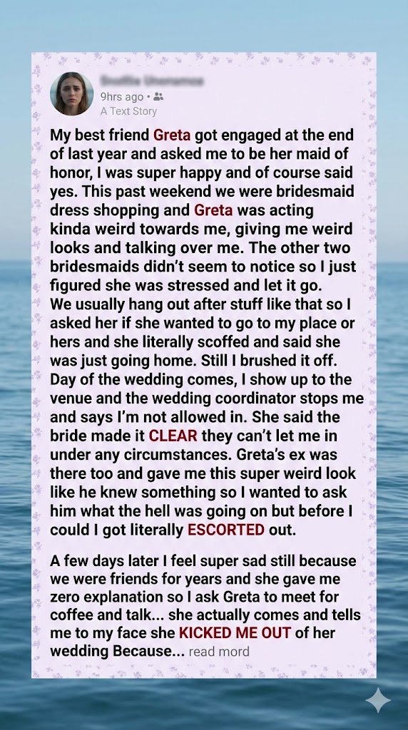 “I need to know why you kicked me out of the wedding,” I said gently. “Why did you think I was trying to ruin your special day? You’re my best friend, Greta. I’d never do anything to hurt you.”