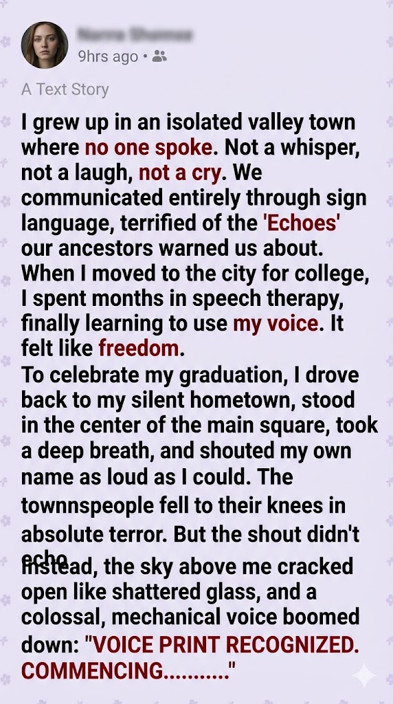 I lowered my hands. I didn’t sign. I looked at my people, still kneeling in the dust of their shattered reality, shielding their eyes from their very first sunrise. I did the only thing I could do. I took another deep breath, offered my hand to Elder Silas, and used the voice I had fought so hard to find.